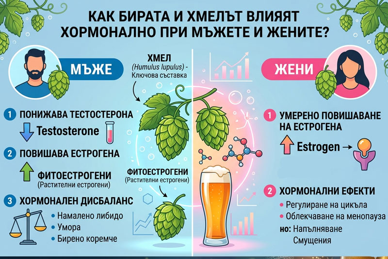 Бирата е една от най-старите и консумирани напитки в света, но малцина се замислят, че основните ѝ съставки – по-конкретно хмелът – съдържат едни от най-мощните растителни хормони в природата. Връзката между консумацията на бира и хормоналния баланс е сложна и се проявява по коренно различен начин при двата пола. Тази статия разглежда как бирата и хмелът влияят на хормоналния баланс при мъжете и жените.